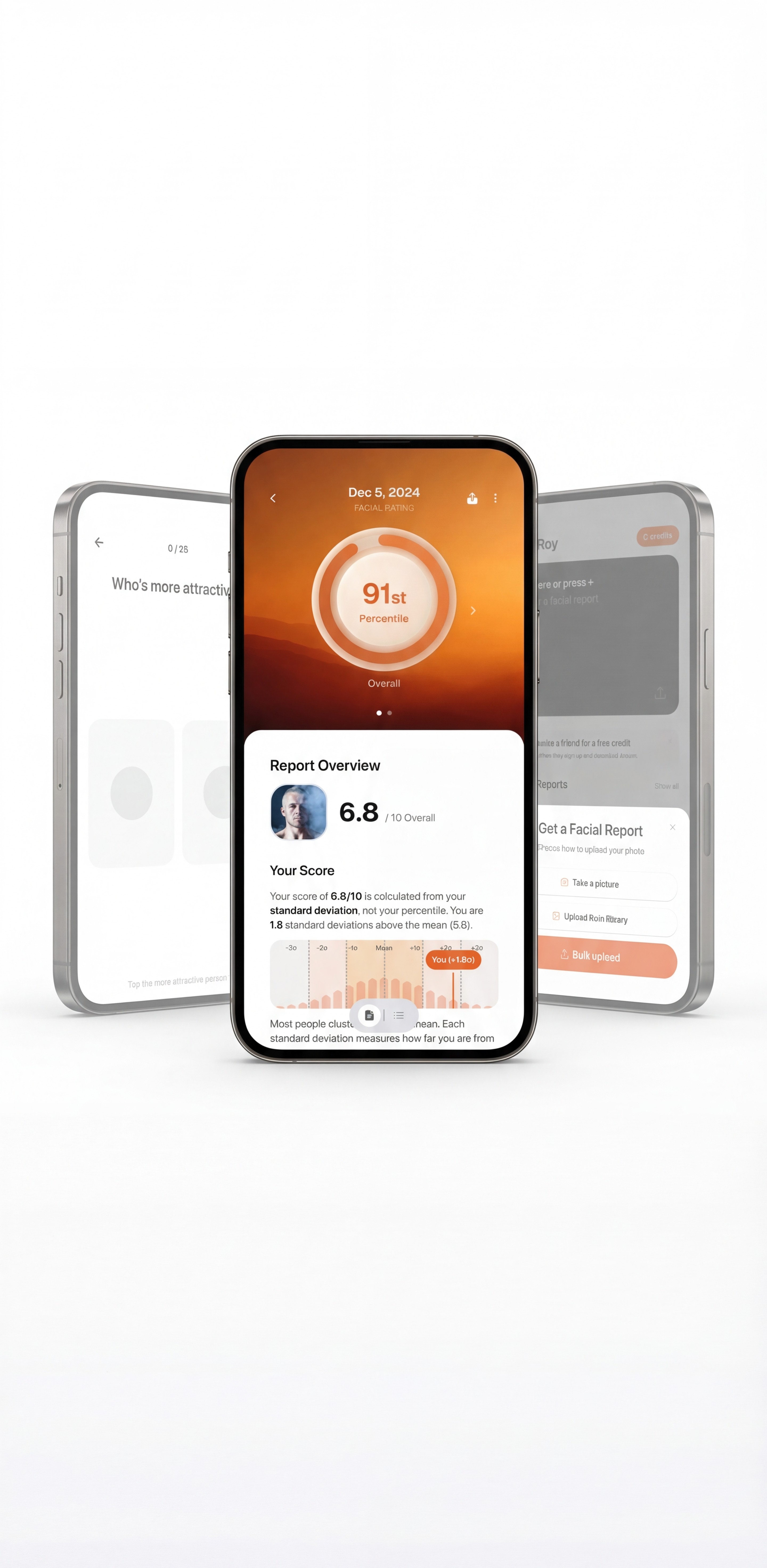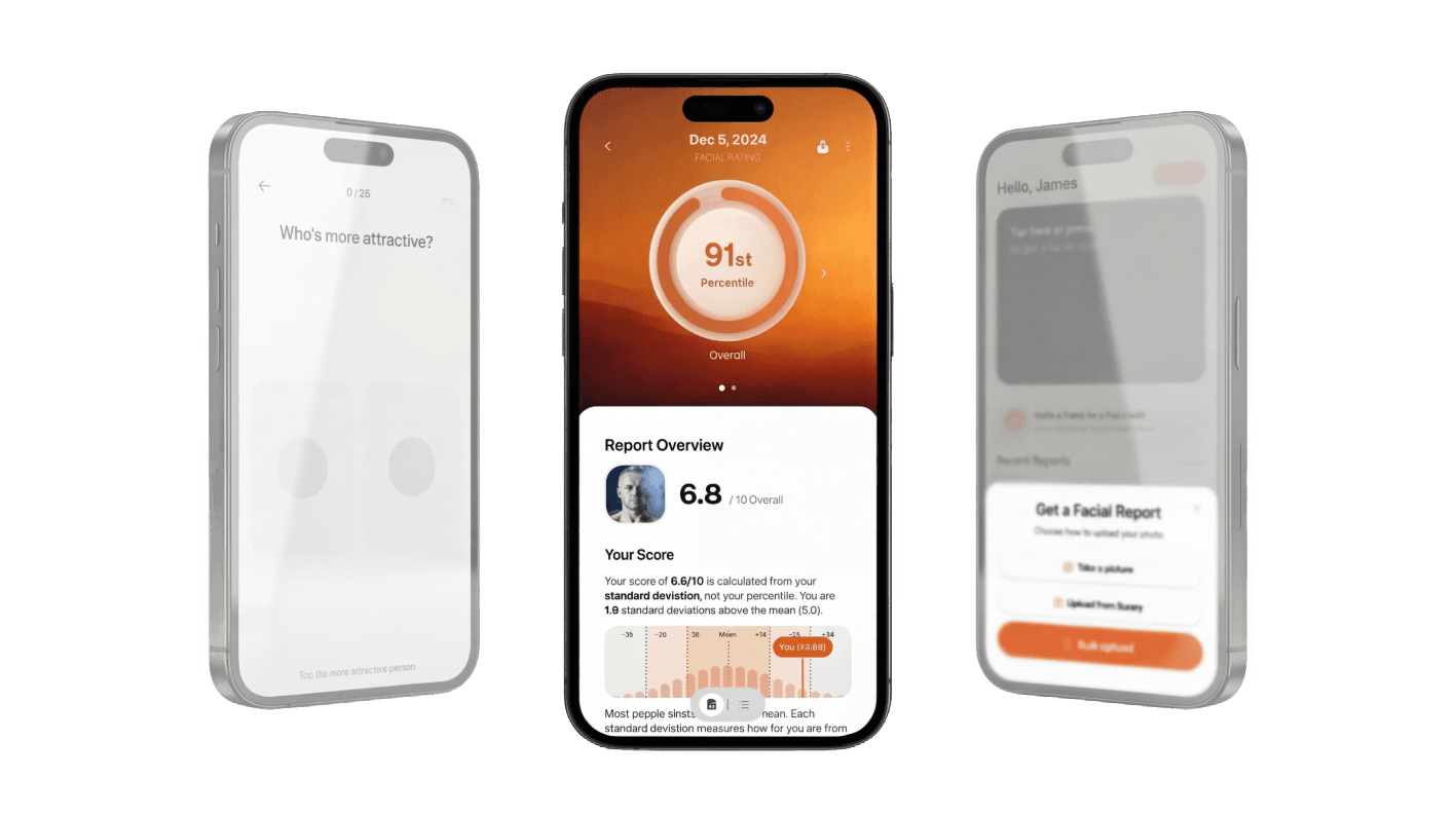 Your overall facial rating is generated from a mathematical model trained on millions of real human votes. It calculates both your percentile ranking and standard deviation score, showing how your facial features compare statistically across a large global dataset.